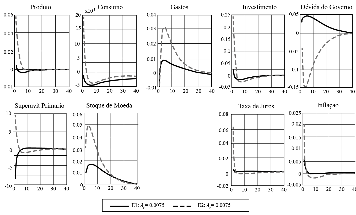 Neste caso, como a expansão da arrecadação de tributos superou o aumento dos gastos públicos no período, esta dinâmica explica o comportamento positivo do resultado primário e da queda da dívida pública. Portanto, no cenário em que a autoridade fiscal manteve a responsabilidade fiscal e cumpriu a regra do teto, o resultado primário apontou um superávit, com crescimento nos cinco primeiros trimestres após o choque. Por outro lado, a dívida pública apresentou significativa retração e manteve a sua trajetória abaixo do estado estacionário em todo o período analisado, confirmando o quão é importante o governo cumprir o teto dos gastos.