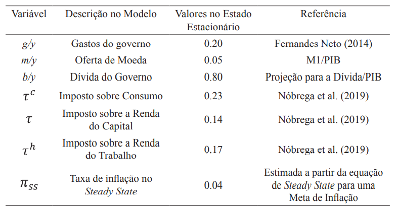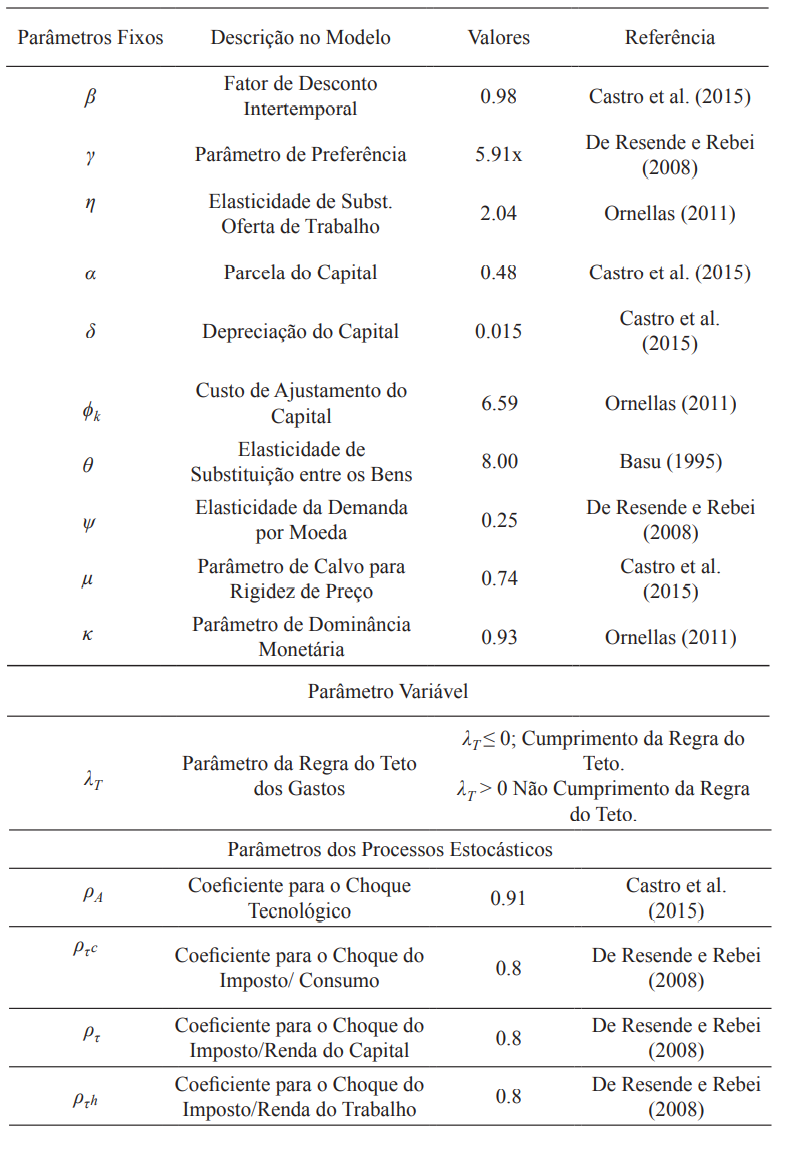 Por fim, podem-se destacar dois parâmetros mais importantes associados às regras de política fiscal explícita no modelo. O primeiro se refere ao , que implicitamente representa a coordenação entre as políticas fiscal e monetária. Este parâmetro foi fixado em 0.93 de acordo com o valor estimado por Ornellas (2011), refletindo a eficiência da política monetária em relação ao cumprimento de uma meta de inflação. Por outro lado, o parâmetro associado à regra fiscal do teto dos gastos do governo, foi calibrado conforme o desejo da autoridade fiscal em cumprir a regra do teto dos gastos. Assim, dado que a regra é cumprida quando , observa-se que o governo cumpre a regra além do estabelecido quando e, ao contrário, descumpre na medida em que .