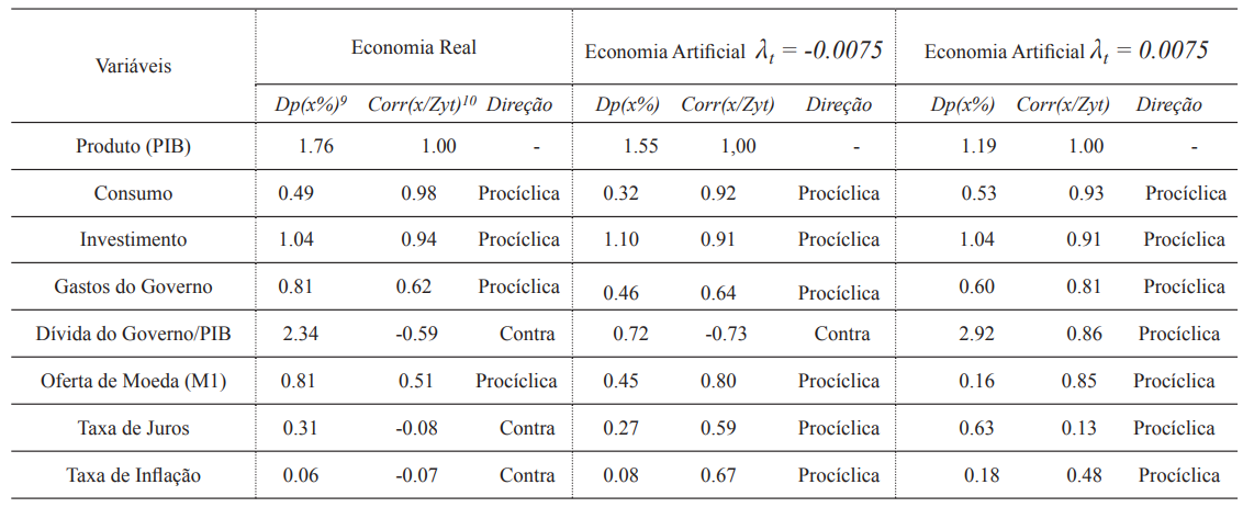 Como os parâmetros do modelo foram calibrados, faz-se necessária uma análise das propriedades cíclicas obtidas a partir da economia artificial. Seguindo o método analítico de Kanczuk (2002), Mussolini e Teles (2012) e Bender Filho et al. (2012), utilizaram-se dados trimestrais entre os anos de 1999 a 2019, disponíveis nas contas nacionais do IBGE, BACEN e IPEA, que foram suavizados utilizando o filtro de Holdrick-Prescott. O objetivo foi separar a tendência do componente cíclico e avaliar o segundo momento das séries e os coeficientes de correlação contemporâneos. As variáveis consideradas na análise foram: (1) Produto Interno Bruto (PIB); (2) Consumo; (3) Investimento; (4) Gastos do governo; (5) Nível de endividamento do governo em proporção ao PIB; (6) Oferta de moeda; (7) Taxa de juros e (8) Taxa de inflação.