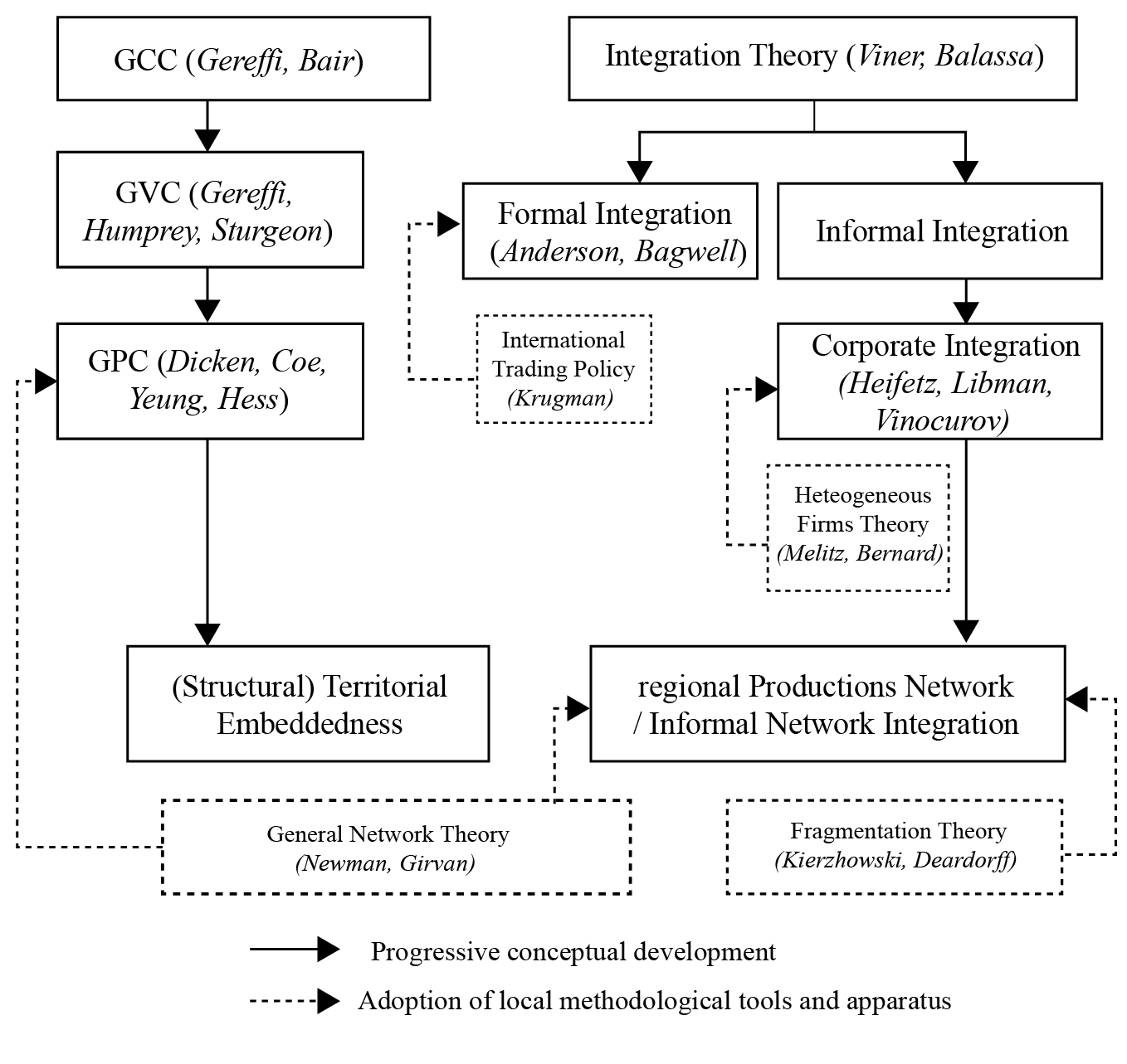 To date, the commonly held definition of GPN is “the nexus of interconnected functions, operations and transactions through which a specific product or service is produced, distributed and consumed” (Coe et al., 2008; see also Henderson et al., 2002; Coe & Yeung, 2015; Iliopoulos et al., 2020). Contrary to concepts of GCC and global value chains (hereinafter, GVC), GPN methodology has a number of distinctive features.