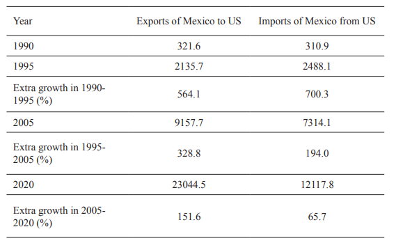 Secondly, some of the previously underdeveloped industrial areas (i.e.,maquiladoras) have managed to attain the world class level in sustainable development and energy efficiency (Munguia et al., 2018). Thirdly, there was a fundamental strengthening of cooperation ties in the automotive sector (Table 1). Already between 1990 and 1995, the growth of auto component exports from Mexico to the United States amounted to more than 560%, and its imports from the United States, to more than 700%.