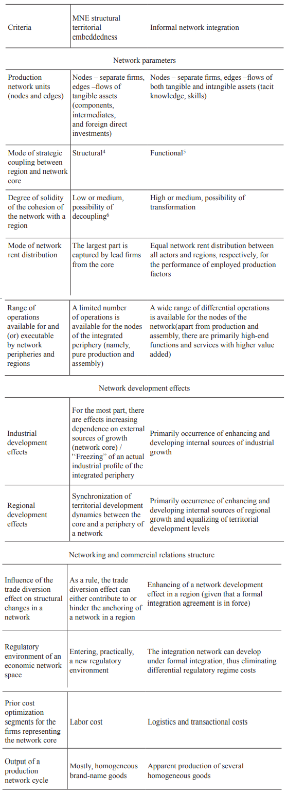 Generally, a network as a specific pattern of interfirm cooperation provides a basis for the formation of modern production systems (Newman, 2018). By definition, its constituents are specific nodes (i.e., enterprises, warehouses, logistic centers, and R&D departments) and linking edges (such as flows of intermediates, foreign direct investments, etc.) At the same time, these networks can either enter a region externally (territorial embeddedness) or emerge in the region naturally through corporate intraregional integration (regional integration). In our opinion, both models stated above are distinguishable by several major features relating, primarily, to the intrinsic organization of the interfirm network cooperation. The features as such offer a region industrial upgrading effects of a new kind.