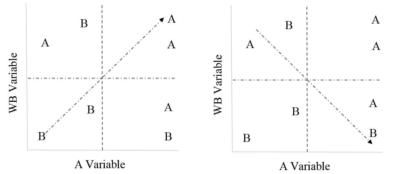 This diagram is divided into four quadrants. The first one, (Q1), contains the regions that present high values for the variable under analysis surrounded by regions that show values above the mean for the analyzed variable. Q1 is called High-High (AA). The second quadrant (Q2) includes the regions with low values surrounded by neighbors that present high values; classified as low-high (BA). In the third quadrant (Q3), there are regions with low values surrounded by neighbors that also have low values; called low-low (BB). Finally, the fourth quadrant (Q4) comprises regions with high values surrounded by neighbors with low values; classified as high-low (AB) (Perobelli, Almeida, Alvim & Ferreira, 2003).