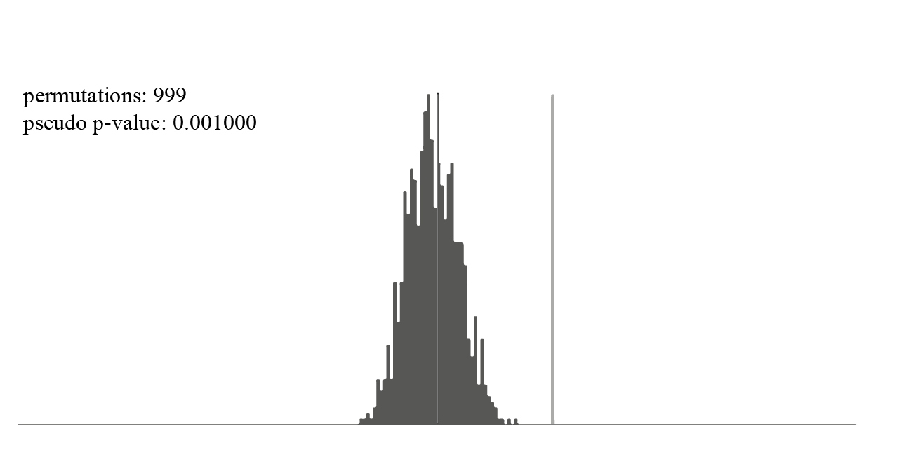 Monteiro, Câmara, Carvalho and Druck (2004) emphasized that, after calculating the Moran’s Index, it is necessary to validate it. Such validation can be performed through the pseudo-significance test, where up to 999 permutations of different values associated with attributes with the regions are generated. Each one produces a new spatial arrangement where the values are distributed. The implicit hypothesis of the calculation of the Moran’s Index is that the data are stationary in first and second order.