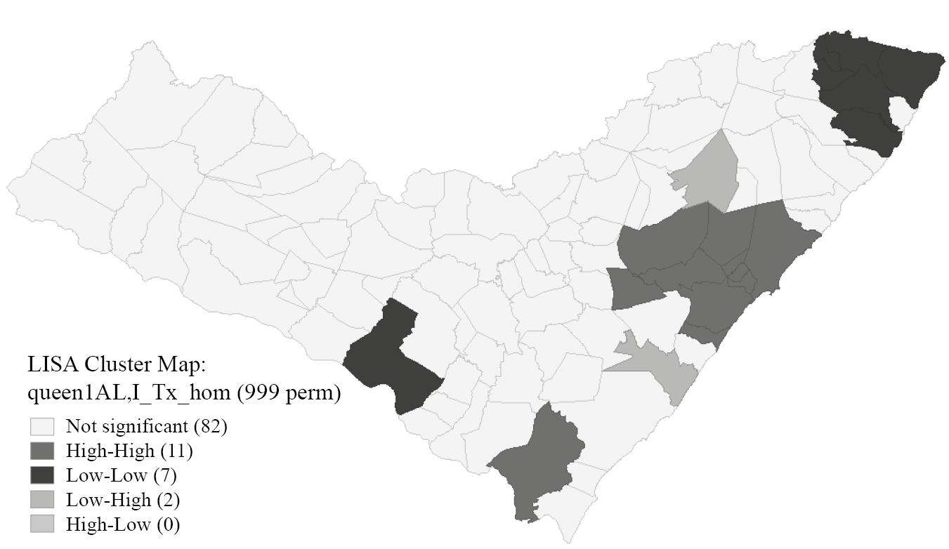 Besides Moran’s I and LISA, our work applied spatial econometrics, since traditional models cannot control spatial autocorrelation caused by the spillovers that the variables produce on and receive from their neighboring ones. Another situation that can be corrected by spatial econometrics is the correlation between errors, which can also be due to territory heterogeneity.