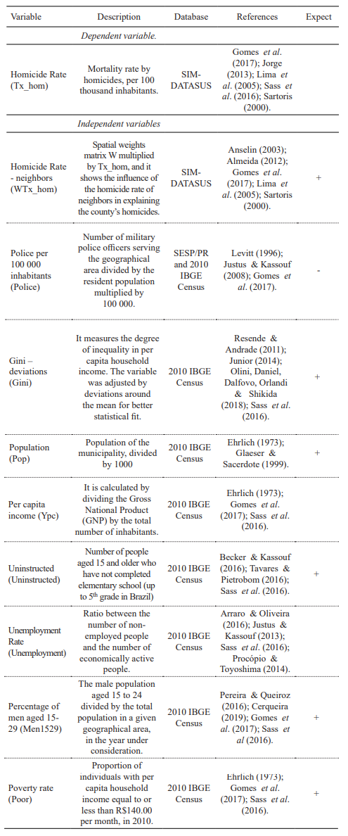 Table 1 describes the socioeconomic variables used to explain the homicide rate behavior, the database sources, some of the principal papers in the literature that used them, and the expected sign of these variables according to the crime economics literature.
