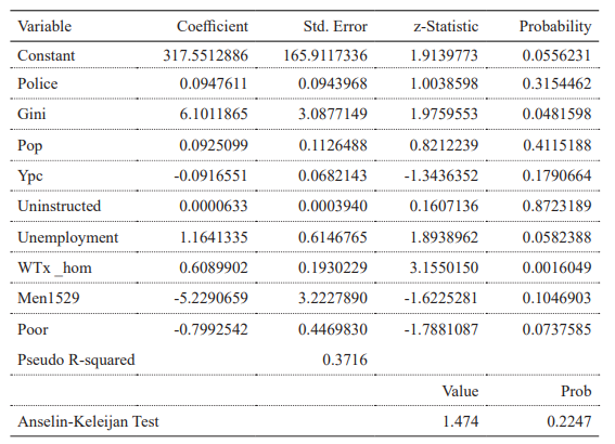 The Gini index was statistically significant at 5%, corroborating the theory and indicating that the greater the income concentration, the greater the homicide rate. Regarding the variables Ypc, Police, Pop, Men1529, and Uninstructed, we could not draw any conclusions, since they were not significant for this analysis. Although the variable Uninstructed was not significant, Grogger (1998) argued that the greatest impact of education is through its role in determining income, and not directly through a reduction in crime propensity.