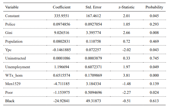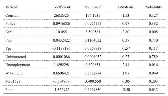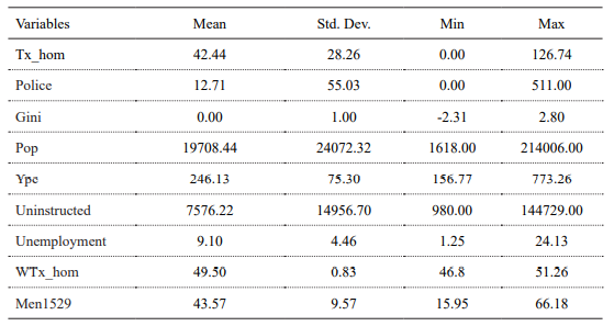 The relationship between inequality, poverty, economic development, and violence can be considered one of the most controversial explanation lines. Although there are many studies on this subject, the results are often divergent. In order to facilitate the results interpretation, we transformed some variables, such as population, which was divided by 1000, and the Gini index, which was expressed as deviations around the mean. We excluded other variables after performing a correlation test, since they indicated the presence of severe multicollinearity problems. Among the correlated variables, we selected those with greater variability in order to obtain a better model, including all the desired dimensions according to the theoretical support.