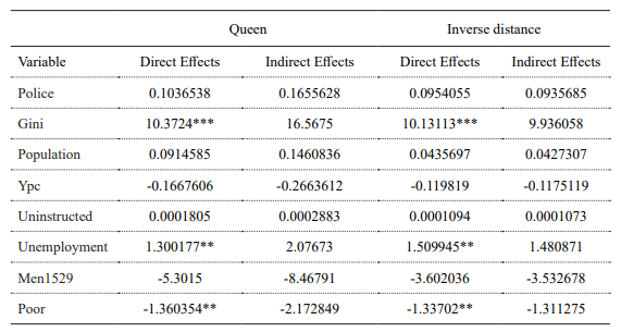 In order to verify how sensitive our results were to the spatial weight matrix choice, we did some tests, as shown in Table A2 (Appendix), where the inverse distance matrix was used. As can be seen, the main conclusions were maintained, the variables of income inequality and unemployment rate have a statistically significant effect and increases in these variables are related to higher homicide rates in Alagoas. In addition, the variable Poor again presents the opposite impact to that expected. The effect of spatial lag on the homicide rate was also significant at 5%.