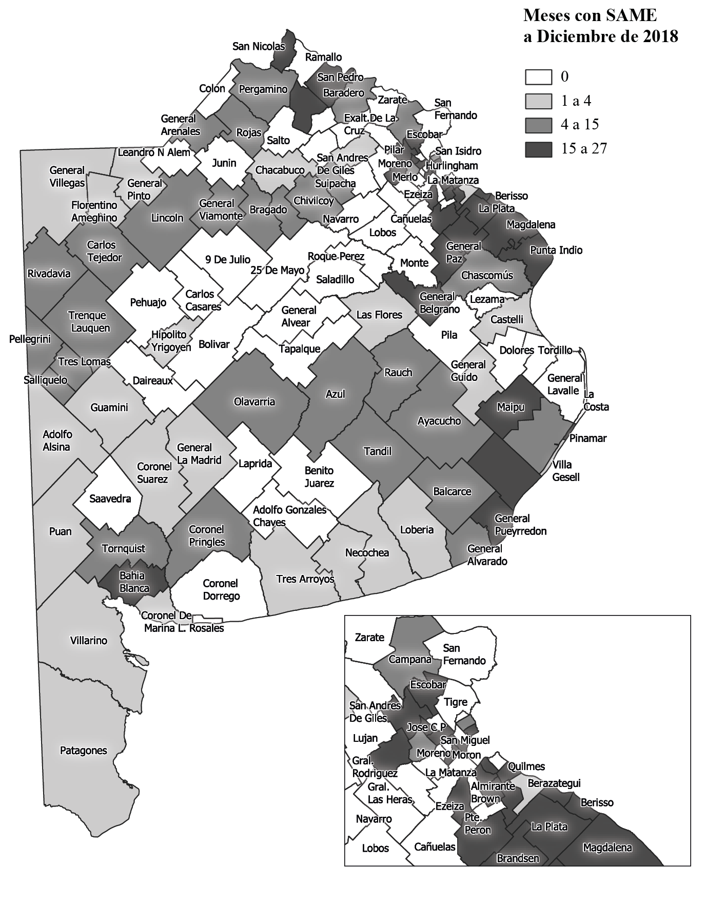 Los dos primeros municipios en implementar el SAME lo hicieron en septiembre de 2016. Un año más tarde, el 25% de los municipios de la provincia (34 municipios) contaba con el servicio, cubriendo al 46% de la población bonaerense. La implementación siguió aumentando hasta llegar a fines de 2018 a un 64% de municipios con SAME y 68% de población cubierta. La figura 1 ilustra la distribución geográfica de los municipios y los meses transcurridos hasta diciembre de 2018 desde la implementación del SAME.