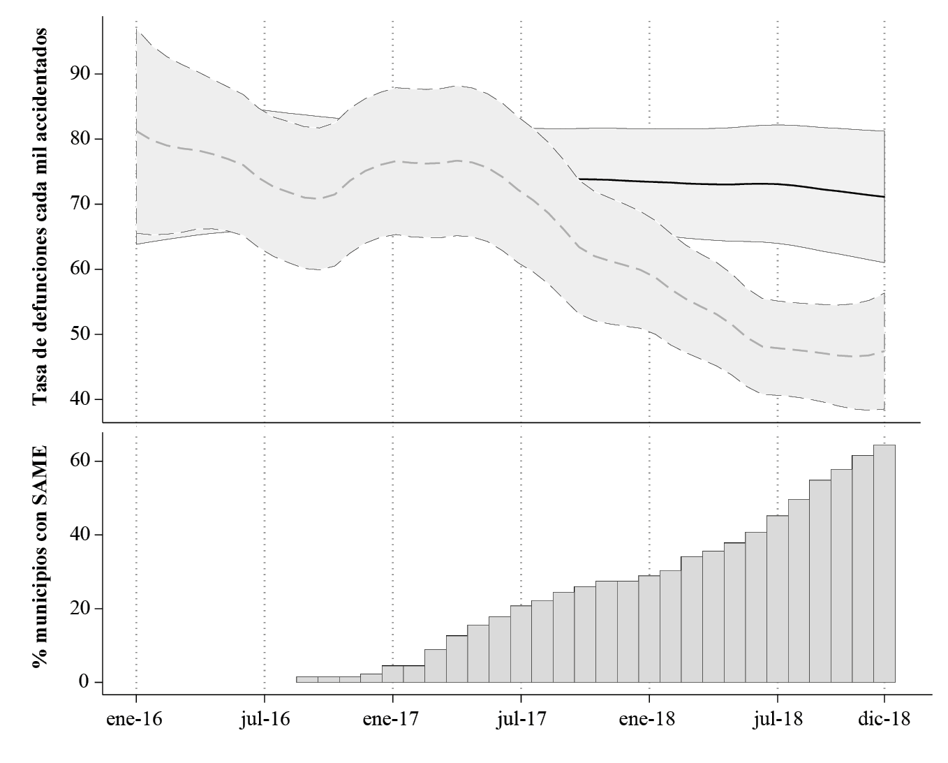 Notas: la figura presenta una estimación no paramétrica de la tasa de defunciones cada mil accidentados en los municipios con SAME (línea punteada) versus sin SAME (línea continua). Las franjas sombreadas son sus respectivos intervalos de confianza al 90%. La estimación se realizó mediante un polinomio local de grado cero, con kernel Epanechnikov y ancho de banda óptimo. En el panel inferior se representa el porcentaje de municipios con SAME en cada mes.
