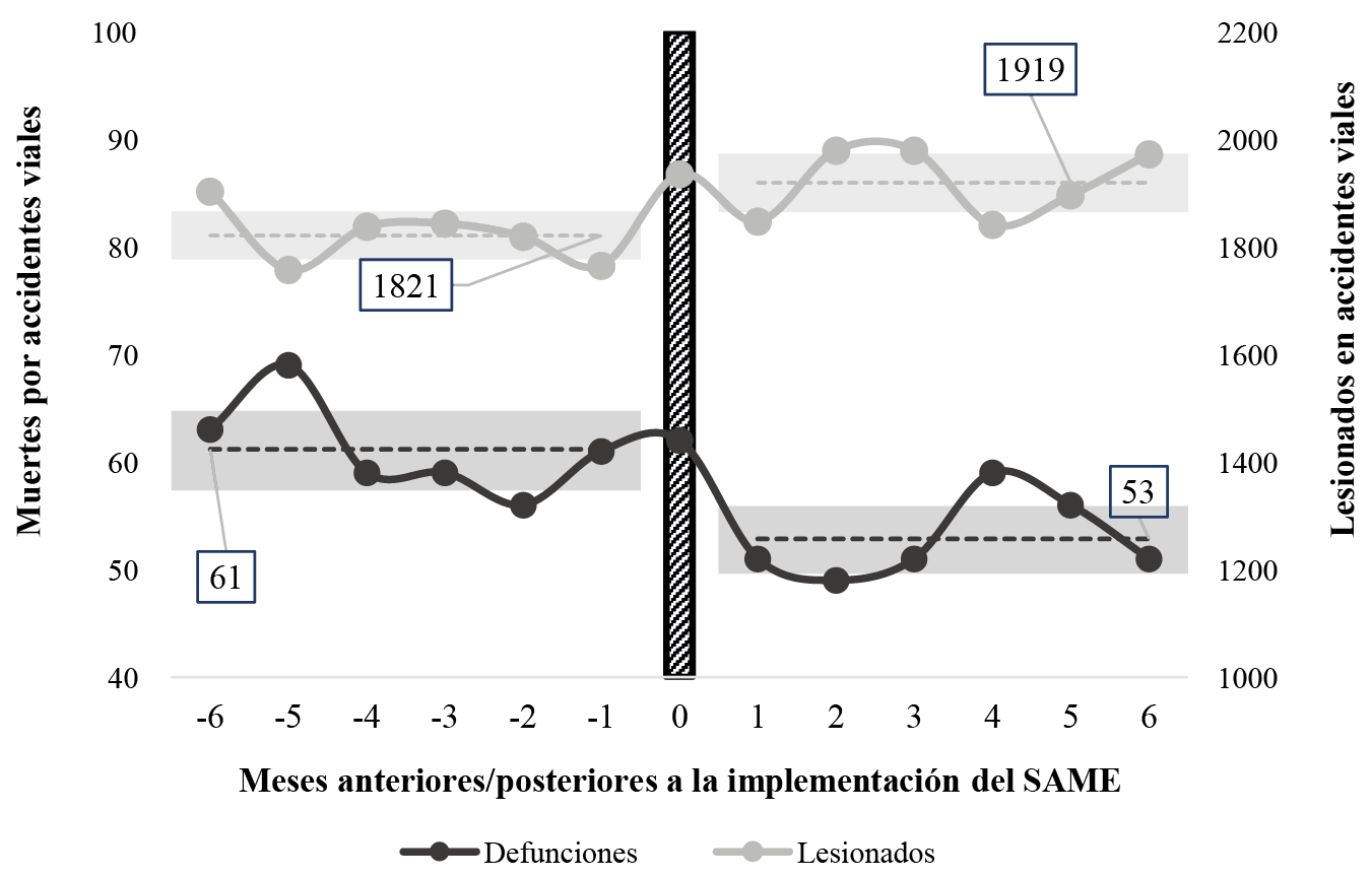 Se observa que a partir de la implementación del SAME (barra vertical), las defunciones disminuyen, al tiempo que los lesionados aumentan. Este resultado tiene sentido y es consistente con un efecto negativo del SAME en la tasa de muertes por accidentes: suponiendo que la cantidad total de accidentados es exógena, una reducción de los fallecidos debería corresponderse con un aumento de los lesionados por accidentes viales.