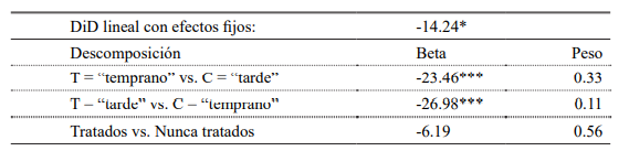 Se puede ver que el efecto encontrado en el resultado principal () es un promedio ponderado de los tres subgrupos. La suma de los pesos de las comparaciones de tiempo (“tarde” vs. “temprano” y “temprano” vs. “tarde”) indica exactamente cuánto de proviene de la secuencialidad temporal del tratamiento (Goodman-Bacon, 2021), en este caso un 44%.