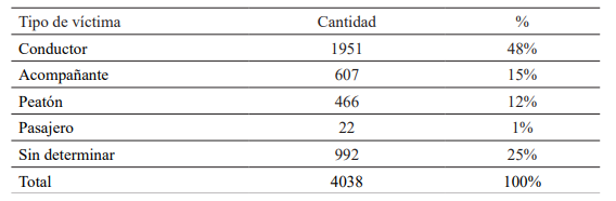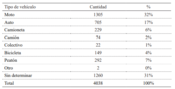 Además, un 32% de las defunciones corresponden a motociclistas, seguido de autos (17%) y peatones (7%), como se puede ver en la tabla A.4. Dado que la cantidad de personas que viajan en moto es inferior a la que viaja en automóvil, es posible afirmar que la mayor cantidad de víctimas fatales en incidentes con motos se debe al mayor riesgo asociado a este tipo de vehículo (DPE, 2019).