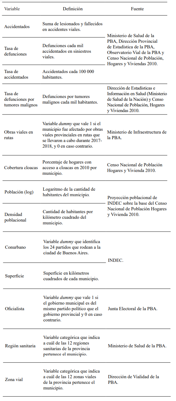 Los principales organismos que disponen de registros sobre accidentes de tránsito, lesionados y muertos por accidentes en la PBA son: 1) el Ministerio de Seguridad, que brinda la información referente a los lesionados y fallecidos en el lugar del hecho; 2) el Ministerio de Salud, que elabora un registro de los lesionados y fallecidos dentro de los 30 días posteriores al siniestro a partir de las bases de egresos hospitalarios y las defunciones generales; y 3) el Ministerio Público de la provincia de Buenos Aires que, a través de la información de las causas iniciadas por homicidios culposos, corrobora el motivo de fallecimiento en caso de defunciones por causas externas sin especificar y complementa la información faltante en una u otra base.