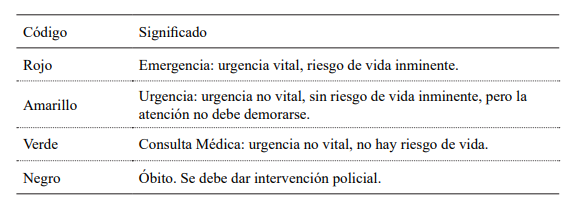 Operativamente, el SAME adopta un protocolo para medicina de emergencias y desastres avalado internacionalmente, conocido como triage. Se trata de un procedimiento de selección y clasificación de pacientes que evalúa las prioridades de atención, privilegiando la posibilidad de supervivencia de acuerdo con las necesidades terapéuticas y los recursos disponibles4. El objetivo es evitar que se retrase la atención de aquel paciente cuyo pronóstico empeoraría por la demora en la atención. A tal efecto, se establecen cuatro niveles de prioridad, descriptos en la tabla 1.