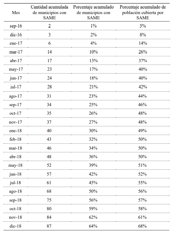 De los 135 municipios bonaerenses, en total son 87 los que implementaron el SAME en el período 2016-2018. La incorporación fue secuencial siguiendo el cronograma de la tabla 2.