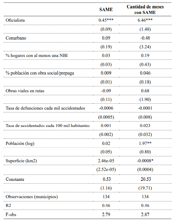 La tabla 3 muestra los resultados de estimar por mínimos cuadrados ordinarios un modelo lineal de la probabilidad de que un municipio tenga SAME (columna 1) y el número de meses con SAME (columna 2) en función de distintas características de los municipios: un indicador de si el gobierno municipal es del mismo partido político que el gobierno provincial en 2016 (Oficialista vale 1 si hay coincidencia del partido político y 0 en caso contrario), un indicador que identifica los municipios del área metropolitana de la ciudad de Buenos Aires (Conurbano = 1), el porcentaje de hogares con al menos una necesidad básica insatisfecha (NBI) en 2010, el porcentaje de población con cobertura de obra social o prepaga en 2010, un indicador de si el municipio fue afectado por obras viales en rutas durante el período de análisis, la tasa de defunciones cada mil accidentados en 2016, la tasa de accidentes cada 100 000 habitantes en 2016, la población municipal de 2016 en logaritmos y la superficie del municipio7, 8.