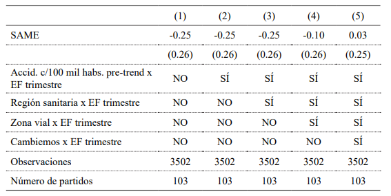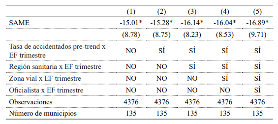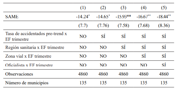 Los resultados son robustos a los cambios en la especificación. El efecto estimado es siempre significativo y su magnitud varía en un rango de -15 a -17 defunciones cada mil accidentados, lo que representa una disminución de entre 19% y 21% de la tasa de defunciones en los municipios que incorporaron el SAME con respecto a la línea de base, es decir, al promedio de defunciones en el período previo a la primera implementación del SAME, que en nuestra muestra se extiende entre los meses de enero y agosto de 201615.