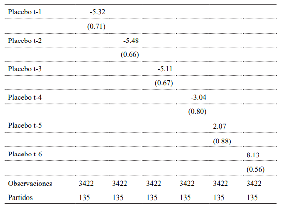 El primer ejercicio consiste en un experimento falso o placebo donde se simula que la implementación del SAME ocurrió en algún mes previo al de su implementación real. Si las conclusiones de la sección anterior son válidas, no deberíamos encontrar efectos significativos de las fechas falsas en las defunciones por accidentes viales. La tabla 5 muestra el resultado de simular que el SAME se implementó de 1 a 6 meses antes de su puesta en marcha verdadera, es decir, se estima el modelo (1) pero con la variable de tratamiento placebo en lugar de la real, y utilizando solamente las observaciones del período pretratamiento. Se puede observar que los coeficientes asociados a las variables placebo no son significativos en ninguno de los casos, con p-valores muy altos.