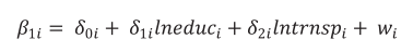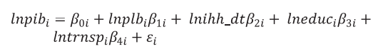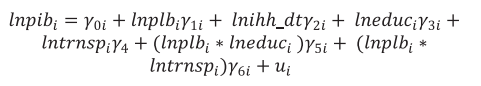 (2)Em que lnpib é logaritmo natural do PIB da microrregião i; lnplb o logaritmo natural do índice de preferência pela liquidez das agências bancárias (plb) da microrregião i; lnihhdt o logaritmo natural do índice Herfindahl-Hirschman dos depósitos a prazo dos bancos, ihh_dt, e lneduc e lntrnsp, o logaritmo natural dos gastos públicos com educação (educ) e transporte (trnsp), respectivamente. Note que o subscrito i na equação 1 indica que cada microrregião pode ter uma sensibilidade diferente, β1i , às variações na preferência pela liquidez dos bancos, ou seja, um aumento em lnplb afeta diferentemente o desempenho econômico, lnpib, das microrregiões.