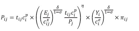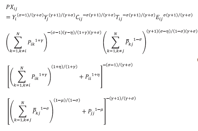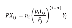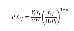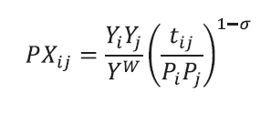 La característica distintiva de la ecuación gravitacional (8) es la presencia explícita de los precios, que difieren entre países debido a los costos inherentes al comercio. Si se añade el supuesto de que la CES y la CET entre bienes domésticos y externos son idénticas, los dos términos de precios en la segunda línea de la ecuación (8) adoptan valor unitario, conservando solo dos términos multilaterales de precios, uno para cada socio comercial. El término se aproxima con los índices de precios de exportaciones del país i; mientras que se aproxima con los índices de precios de importaciones del país j. Los últimos dos términos, entre corchetes, se aproximan con los deflactores del producto bruto de i y j, respectivamente.