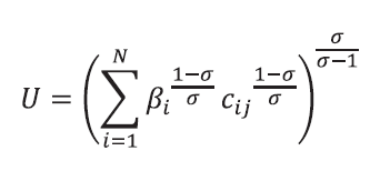 (16)La función de utilidad expresada en la ecuación (16) resulta similar a la de la ecuación (9) con la única diferencia sustancial de la ponderación del nivel de consumo. Mientras que en la ecuación (9) se emplea un parámetro arbitrario,, en la ecuación (16) se emplea, a tal fin, el número de variedades.