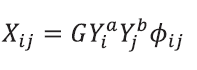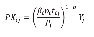 (25)Donde , y son variables endógenas que captan cómo los precios de los insumos afectan a los costos variables de producción, a los costos fijos de entrada a los mercados y a los costos de exportación, respectivamente. Ej es el gasto total en el destino j, Y es el valor total de ventas para los productores del origen i y I es una función de parámetros estructurales, diferentes a los costos variables del comercio.
