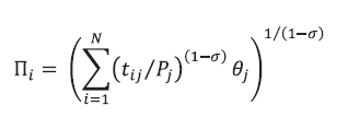 La consideración explícita, la operacionalización y el análisis de estos términos es un aporte fundamental de Anderson y van Wincoop (2003). Pjes un término de resistencia multilateral interna o entrante, que representa la facilidad de penetración del mercado de destino j. Análogamente, es un término de resistencia multilateral externa o saliente, que capta la facilidad de acceso del exportador i a los mercados de destino1.