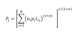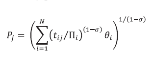 (10)Las diferencias de precios entre mercados de exportación están determinadas por los costos, de manera que si pies el precio del exportador i y es el costo ad valorem de llevar a cabo la operación comercial, el país de destino j enfrenta un precio pij = pitij. En tanto que Pj es el índice de precios al consumidor con CES, del país j, que se expresa como: