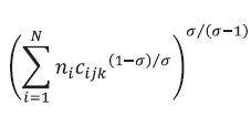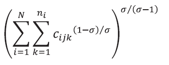 (15)Donde cijk es el consumo de los hogares, en el país j, de la variedad k procedente del país i. En tanto nies el número endógeno de las k variedades producidas en el país i. Si se asume que todos los productos de un exportador dado entran simétricamente en la función de utilidad, la ecuación (15) se simplifica a la siguiente expresión: