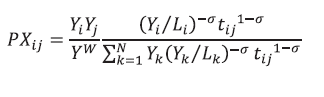 El paso final para derivar el modelo gravitacional estructural consiste en establecer la condición de equilibrio entre el valor de la producción en el país i, Yi, y el gasto total que todos los países realizan en dicha producción, incluido el propio país i. Entonces se puede resolver la siguiente ecuación gravitacional: