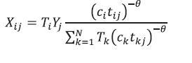 (6)Anderson (1979) modificó la ecuación gravitacional (6), extendiéndola hacia diferentes variantes, que admiten la presencia de bienes transables y no transables, o múltiples sectores productivos. Dichas variantes incluyen fricciones o impedimientos para comerciar, asumiendo costos de transporte y aranceles positivos. Por ejemplo, si se asumen preferencias Cobb-Douglas, un único costo representado por la distancia y la existencia de bienes no transables, Anderson (1979) expresa la ecuación (6) como: