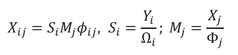 En tal contexto, el valor del flujo comercial originado en un país i y destinado a otro país j,PXij, está representado por: