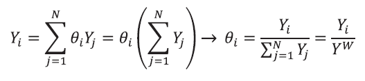 (4)donde es la fracción del ingreso que un cierto país j gasta en el bien procedente del país i, siendo dicha fracción igual, para todos los países —debido a las preferencias idénticas y homotéticas—. Por otra parte, Yj es el producto bruto nominal del pais j. Dado que la producción de cada país i consume domésticamente o se exporta, la condición de equilibrio implica que la producción mundial es producida por igual entre todos los países, de modo que cada país produce una fracción .