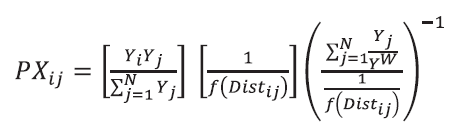 La ecuación (2) se basa en dos condiciones importantes, vinculadas a la distribución espacial del gasto del país importador y a la condición de equilibrio del país exportador. La primera condición es que el gasto total del importador, Xj, puede ser visto como un total a repartir entre diversos proveedores. La segunda condición es que la proporción del gasto asignado por el país j a los bienes producidos por el país i, es . El requerimiento crítico es que dicha proporción pueda ser expresada como . En particular, mide el conjunto de oportunidades de consumo de la población del país j, lo que resulta equivalente al grado de competencia en el mercado. Por otra parte, la suma de las exportaciones del país i a todos los destinos j —incluido el propio país i, es decir, el comercio doméstico— debe ser igual al valor de la producción total de i,.