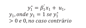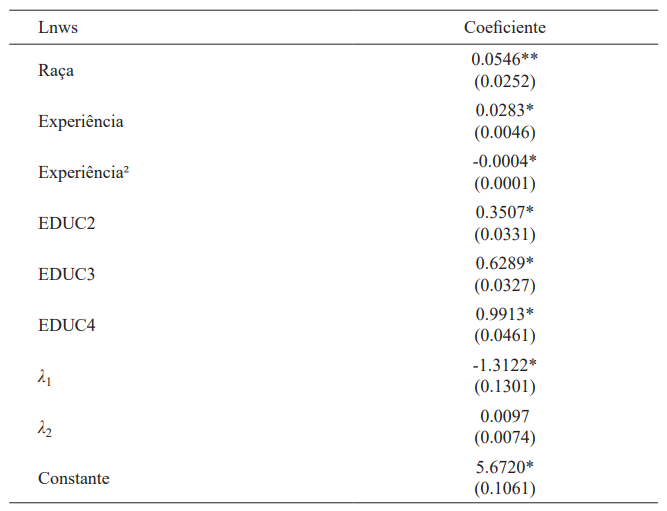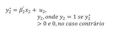 (2)A variáve l corresponde à probabilidade de participação no mercado de trabalho, e indica a probabilidade de participar do mercado de trabalho. Ambas as variáveis são dependentes, e não são diretamente observadas. Com o intuito de captar a probabilidade de participação, essas variáveis possuem características binárias, sendo que, na primeira equação, assume valor igual a 1, quando o trabalhador participa do mercado de trabalho secundário, e zero, caso não participe. Definições semelhantes se aplicam à variável , que assume valor igual a 1, caso o indivíduo seja economicamente ativo, e zero, se está fora do mercado de trabalho.
