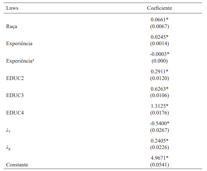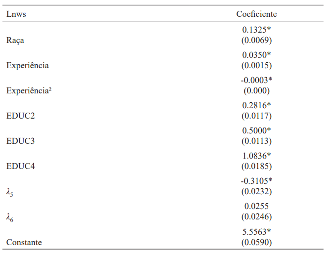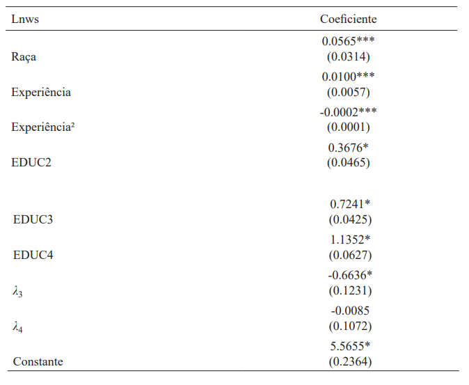 As Tabelas 6, 7, 8 e 9 apresentam as regressões dos salários com os respectivos termos de correção da seletividade (𝜆) e os impactos das variáveis explicativas sobre o logaritmo dos rendimentos dos demais trabalhos.