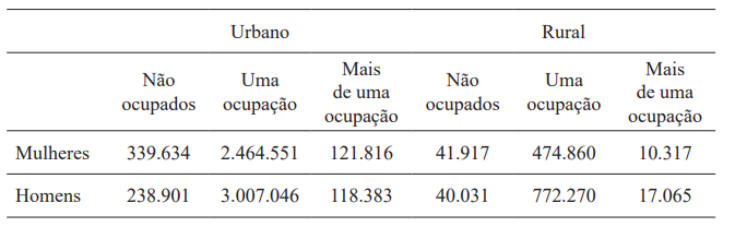 Os dados utilizados neste trabalho foram obtidos no Censo Demográfico de 2010, disponibilizado pelo Instituto Brasileiro de Geografia e Estatística (IBGE). A população estudada é formada pelos indivíduos ocupados com um ou mais de um emprego, e pelos não ocupados, com idade entre 16 e 65 anos. A Tabela 1 apresenta a distribuição entre rural e urbano da população economicamente ativa e o número de ocupações desenvolvidas na semana de referência da pesquisa. Segundo os dados, as mulheres representam a maioria da amostra de moonlighters na zona urbana, enquanto os homens são maioria entre os indivíduos que participam no mercado de trabalho tendo emprego secundário na zona rural.