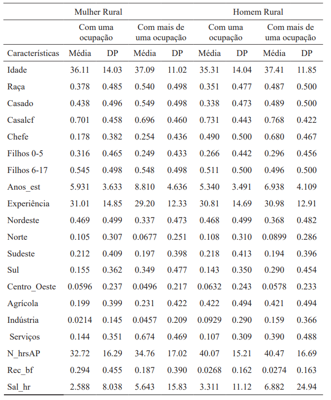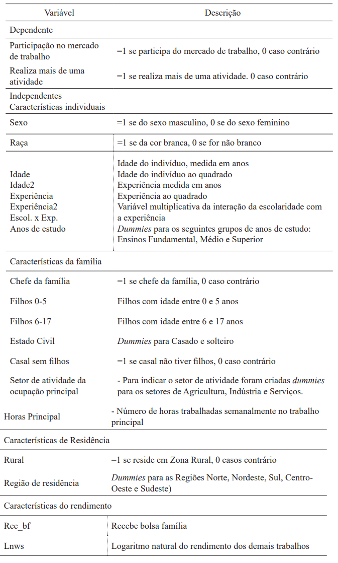 Outra questão a ser abordada nesse artigo é verificar se os fatores que influenciam os trabalhadores dos sexos masculino e feminino a ingressar no mercado de trabalho buscando emprego secundário são semelhantes. Trata-se de um tema pouco abordado pela literatura brasileira, principalmente no que concerne ao meio rural. Portanto, espera-se que os resultados encontrados atuem para a compreensão da dinâmica do mercado de trabalho brasileiro, como também para impulsionar novas pesquisas nessa área.