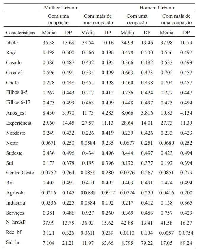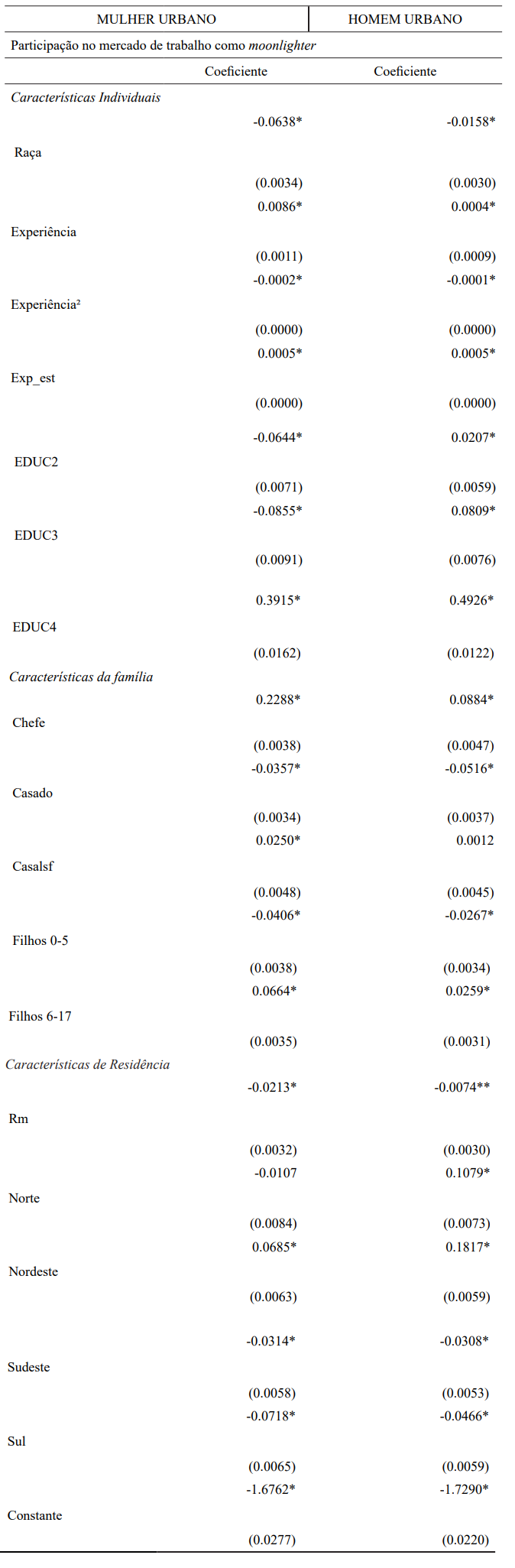 Ao analisar as moonlighters de sexo feminino da zona urbana na Tabela 3 (coluna 3), observa-se que as mulheres que participam do segundo emprego têm uma média de idade de aproximadamente ٣٨ anos, 53% são casadas e têm filhos, 46% têm filhos com idade superior a seis anos, 45% assumem o posto de chefes de família e possuem maiores níveis de educação, enquanto que as mulheres com apenas uma ocupação tendem a ser mais jovens, em média apresentam uma quantidade menor em relação aos anos de estudos e têm filhos com idade inferior a seis anos.