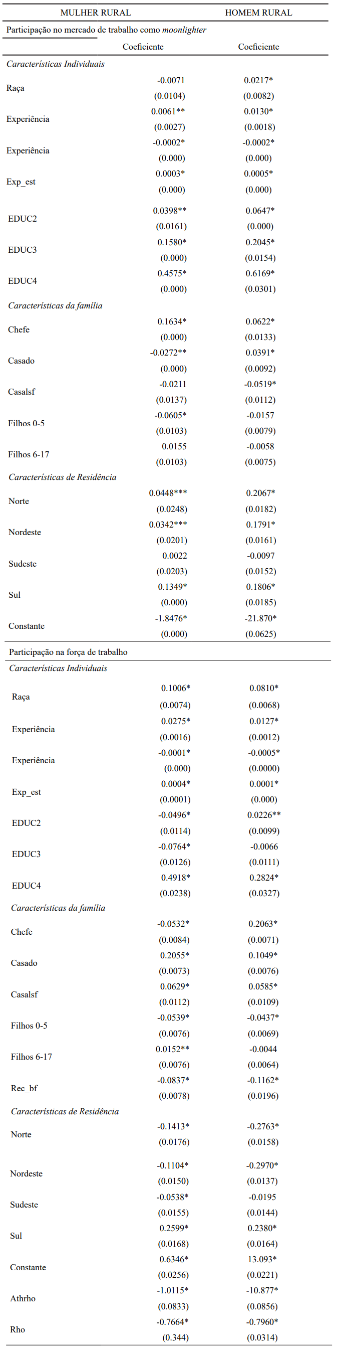 A Tabela 4 apresenta as estimativas das equações de participação no mercado de moonlighters e participação na força de trabalho. O coeficiente ρ (rho), que mede a correlação entre os termos de erro das duas equações, apresenta um valor negativo e estatisticamente significante, denotando que participar do mercado de trabalho e ter mais de uma ocupação são atividades concorrentes na decisão de alocação de tempo dos trabalhadores. Portanto, com o resultado do ρ≠0, conclui-se que as equações devem ser estimadas conjuntamente em um modelo Biprobit. Pode-se verificar a relação e a significância das variáveis que explicam os fatores condicionantes para participação nesse mercado e participação na força de trabalho para homens e mulheres da zona rural.