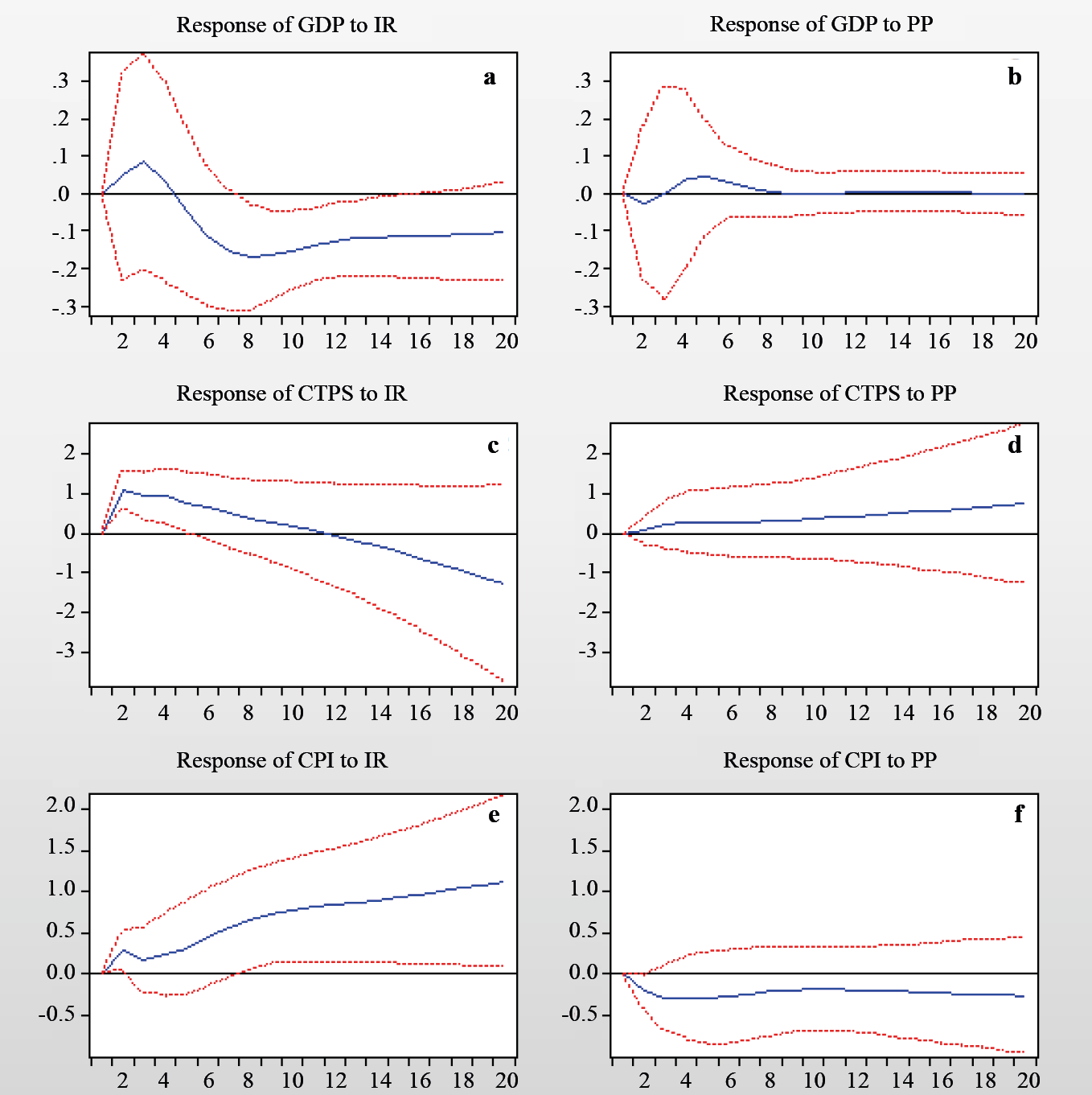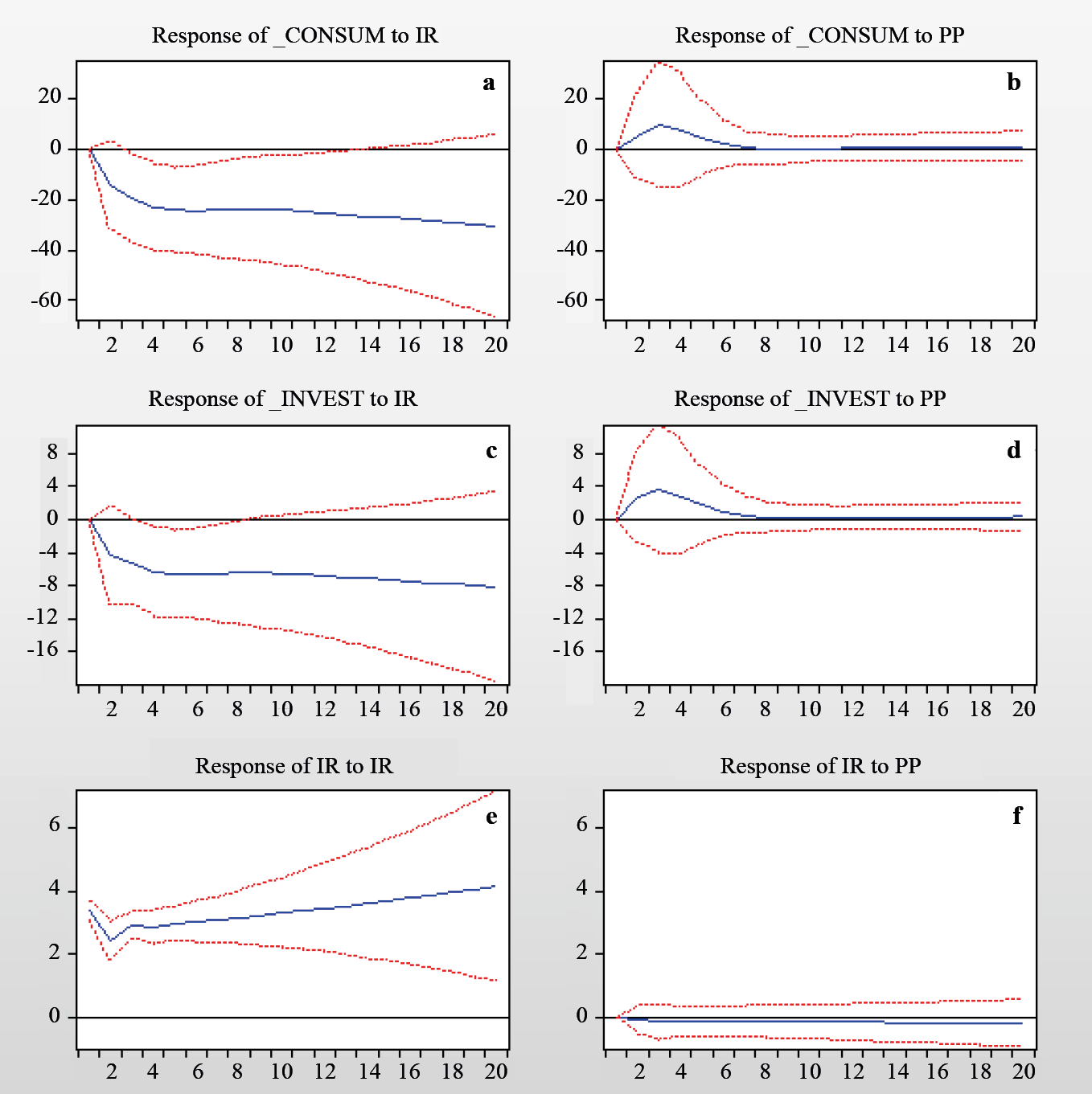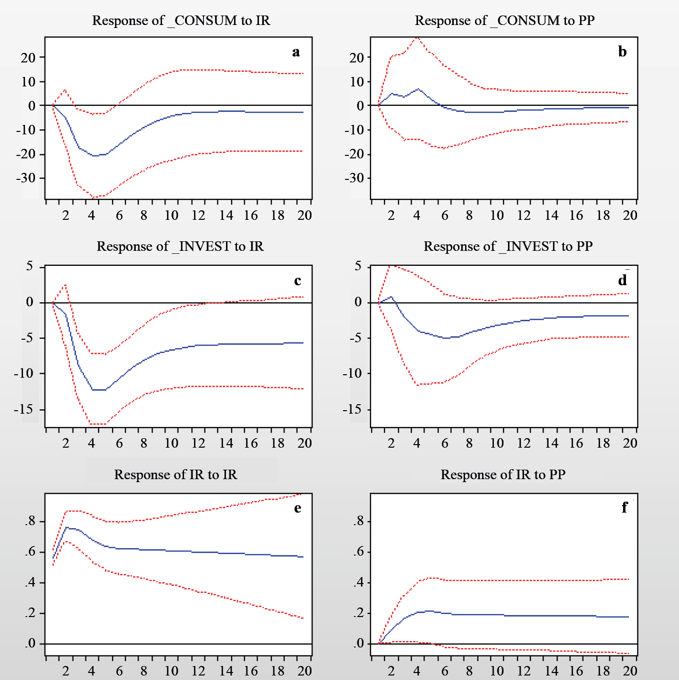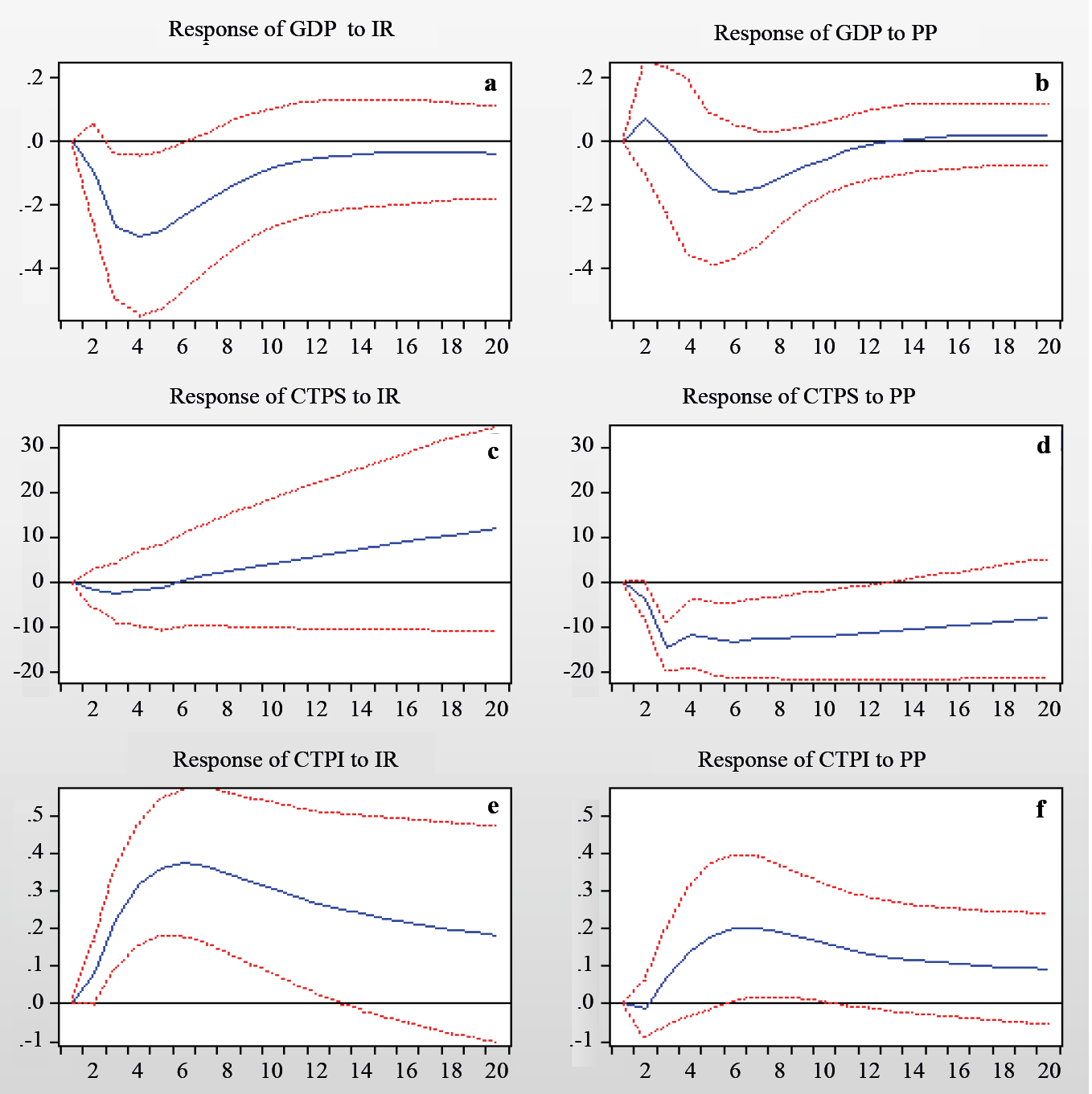 Part (a) of Figure 3 shows the expected result of real GDP in relation to the increase in the interest rate. It indicates that this variable is negatively affected in view of changes in monetary policies. This impact is in line with economic logic, as the interest rate reduces real GDP in the short term.
