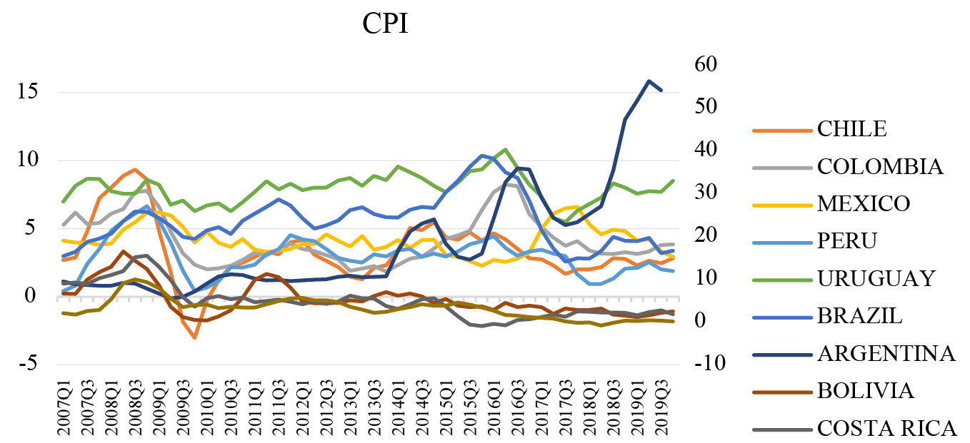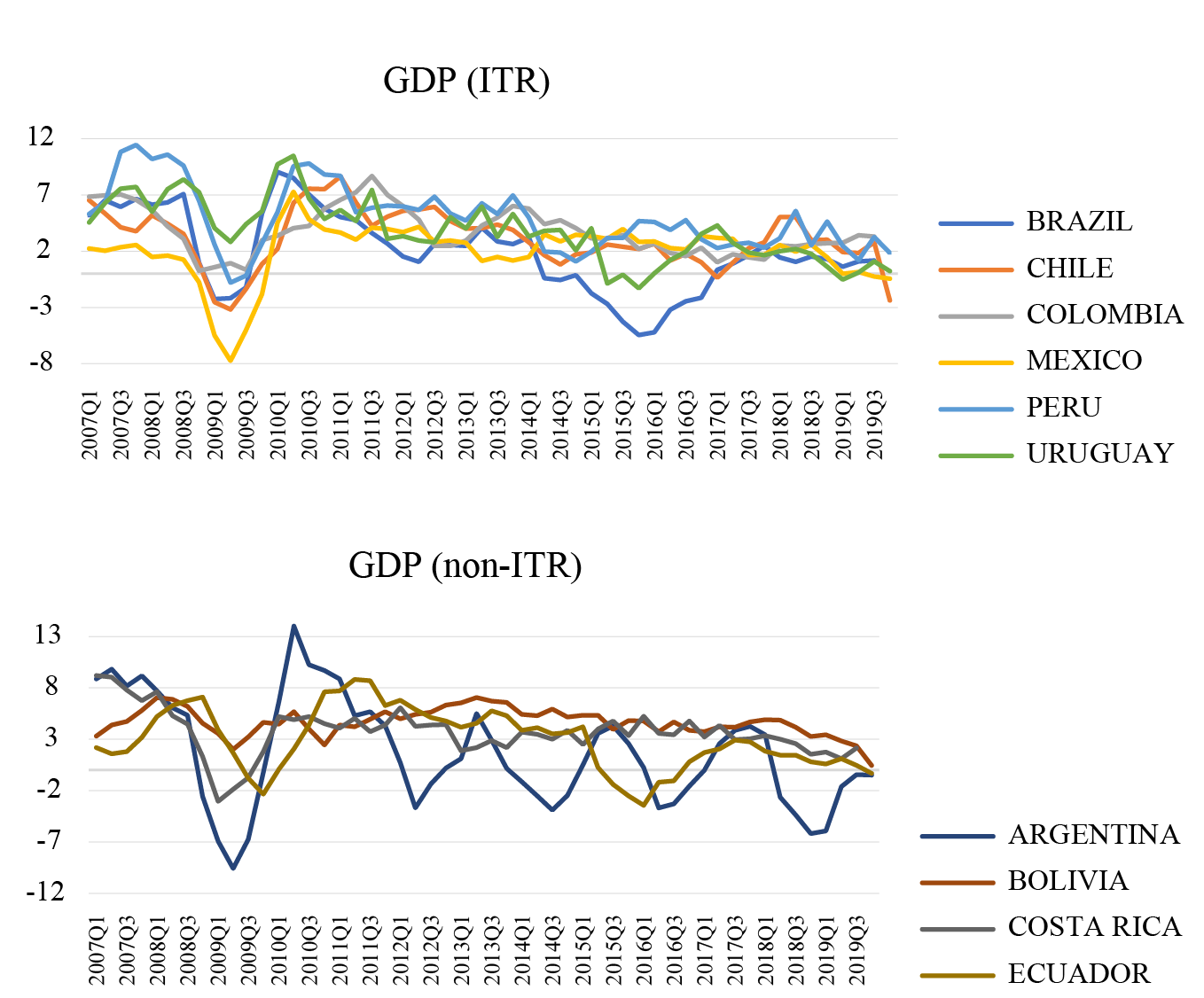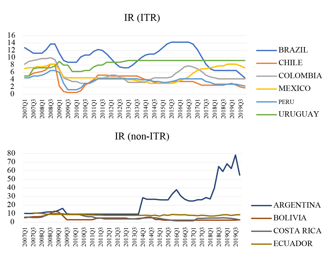 We separated the countries into two groups. The first one comprises nations that adopt the ITR (Brazil, Chile, Colombia, Mexico, and Peru). The second those that have different monetary arrangements (Argentina, Bolivia, Costa Rica, and Ecuador). These groups make up the comparative analysis of the study. We analyzed the period between the first quarter of 2007 and the fourth quarter of 2019. The assessment was started in 2007 to capture the movements of the variables from the first signs of the GFC and to identify the policies applied since then.
