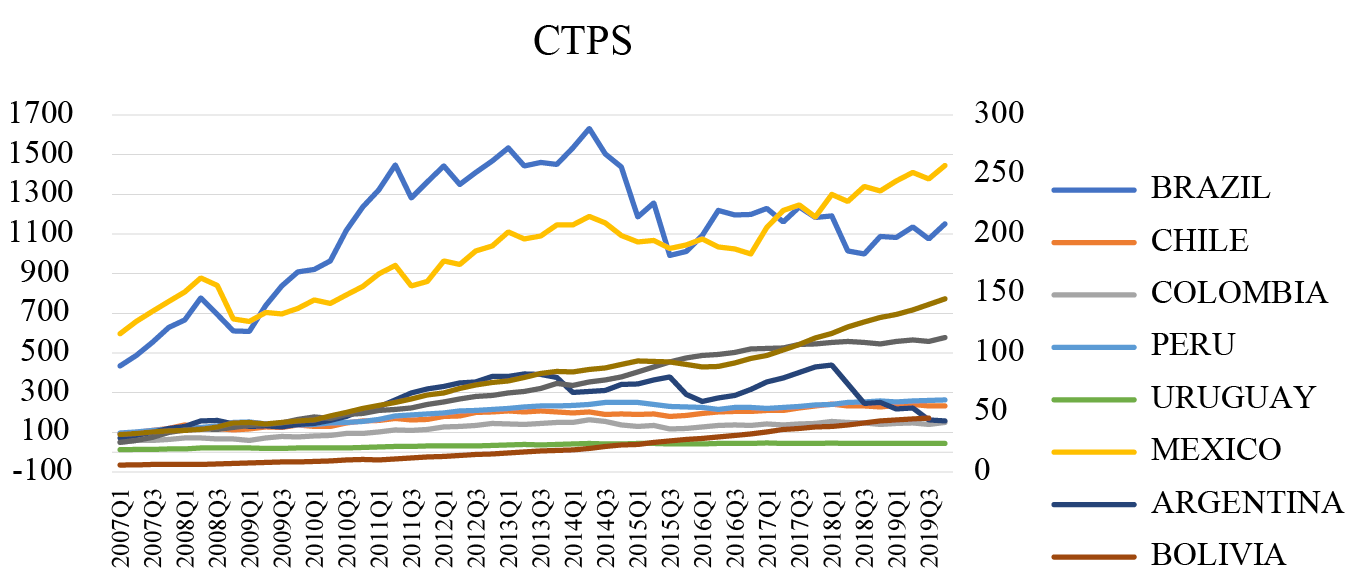 As can be seen in Chart 1, all the countries studied showed a weak economic performance as of the third quarter of 2008, which reflects the deleterious impact of the GFC. This fact is a consequence of the strong link between the Latin American economies and the United States, the epicenter of the crisis. Argentina, given its various internal crises, had other moments of negative real GDP, specifically in 2012, 2014, 2016, and between 2018 and 2019. Brazil, with the political and economic crisis of 2015, also experienced negative percentages of real GDP until the beginning of 2017.