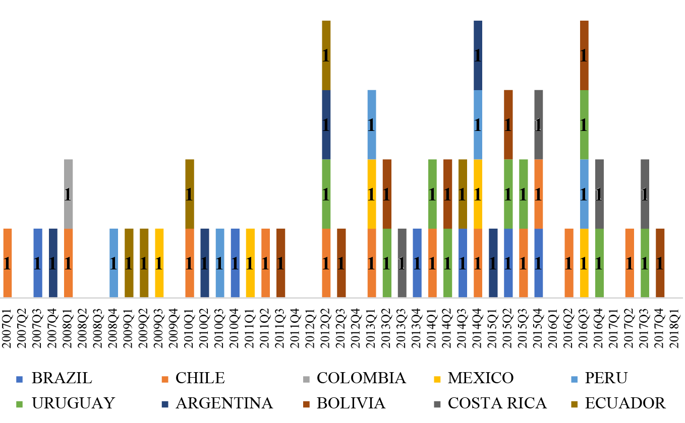 Finally, Chart 5 presents the dynamics of the implementation and maintenance of macroprudential policies in the Latin American countries studied. As can be seen, there is a concentration of macroprudential measures in the period from 2014 to 2016.