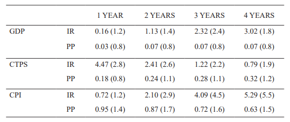 Note: PP = dummy variable for the policy; CPI = percentage change in the price level; GDP = percentage change in real GDP; CTPS = credit to the private sector; and IR = interest rate.