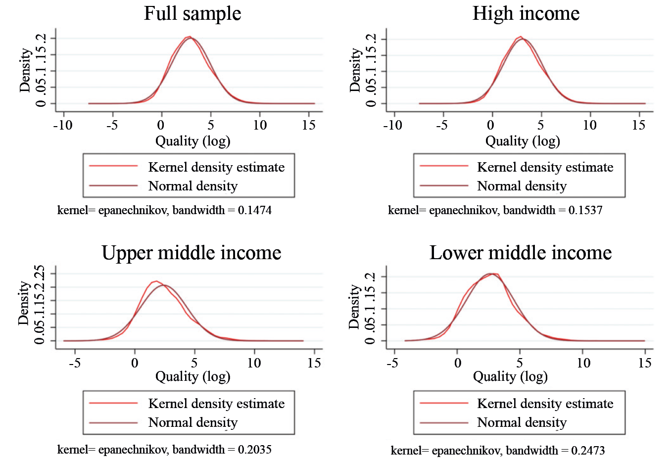 We identify in Figure 1 that the variable quality is distributed similarly to a normal distribution for all income groupings. However, there are slight differences among them. Most observations in the panels representing both the full sample and high-income partners lie in a higher-density region compared to the bottom panels. Such a finding is not surprising whatsoever, given that most Brazilian imports originated in countries with a high-income level, as shown in Table 2.