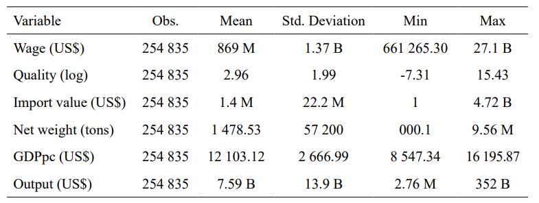 This section is divided into two parts. The first one shows the descriptive statistics of the variables used. The second part presents the results of the fixed effects and the unconditional quantile regression models relating the quality of Brazilian imports and wages paid by sectors producing similar goods nationally.