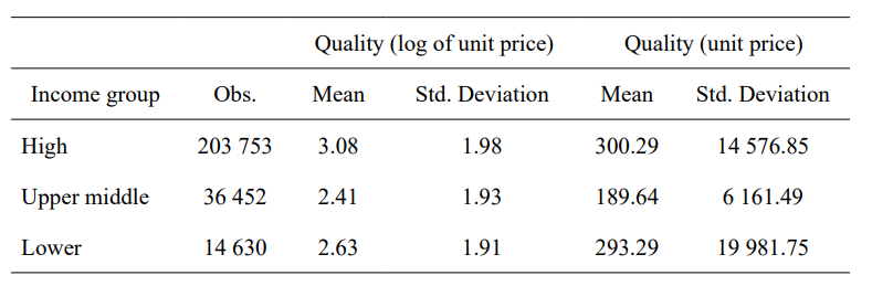 Lower middle-income economies represent only 5.7% of our baseline sample. Although these countries have a slightly similar mean value (in comparison to high-income ones) for the quality of their exports, the standard deviation for this grouping is relatively high and the number of observations is drastically smaller. This suggests that the subsample is rather heterogeneous.